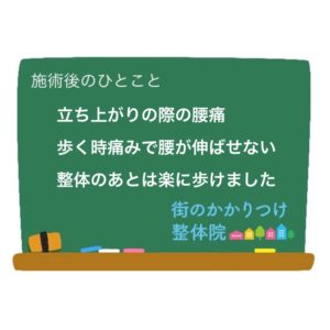 前日に中腰で重いものを押したときに痛みが生じ、今朝になって更に痛みが増したので来院。 胸椎のねじれが2箇所、腰椎に1箇所、左の腹部が硬くなっていました。 脚を伸ばして上向き寝が出来ない→内臓調整→脚が伸ばせた。 背骨のね […]